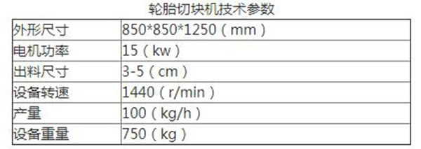 【輪胎切塊機產(chǎn)品介紹】 輪胎切塊機是輪胎粉碎機生產(chǎn)線(xiàn)中的第三道設備,將切成條后的輪胎切割成3-5cm的小塊,從而便于粉碎機粉碎。 【輪胎切塊機技術(shù)參數】